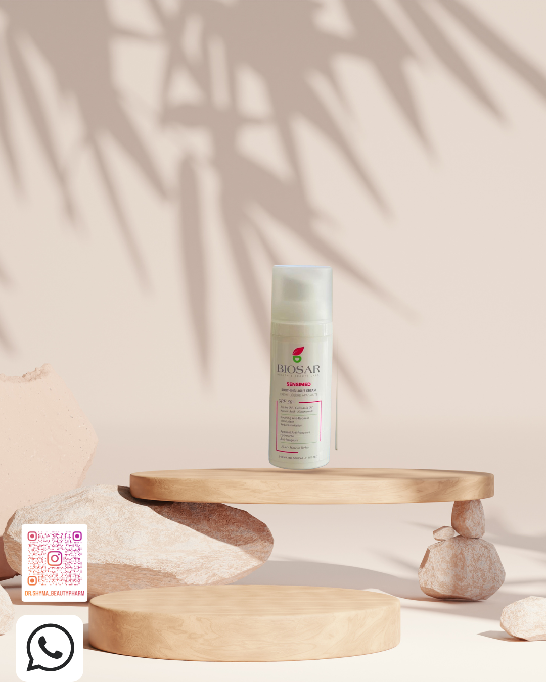 كريم خفيف مهدئ من شركة Biosar، مخصص للبشرة الحساسة والمتهيّجة، ويحتوي على واقي شمس +SPF 30 لحماية يومية من أشعة الشمس.